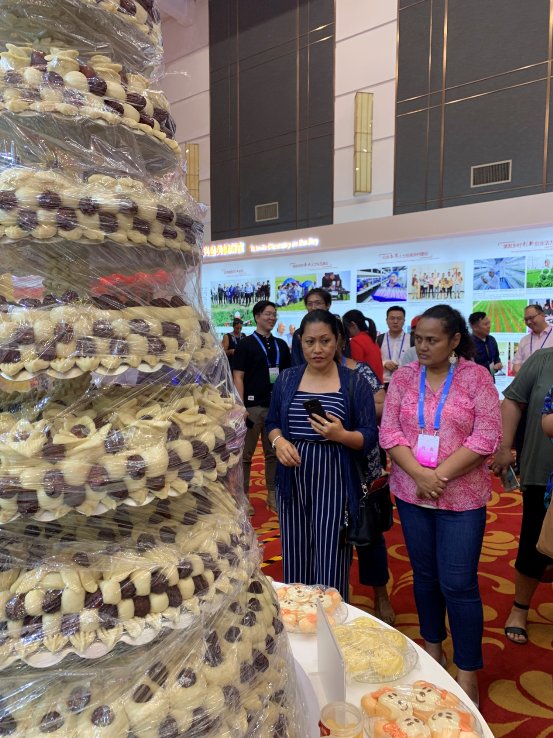 “這座‘小山’是用面包堆成的嗎?太不可思議了!”斯里蘭卡統一國民黨干部考察團成員尼蘭德興致勃勃地問。吸引尼蘭德的“面包山”,是位于展廳中心位置的“國人廚房”區域的福棗山。這座福棗山是由好想你送展的,用河南傳統的棗花饃堆成,共有十層,每一層做工精巧、形狀各異 。