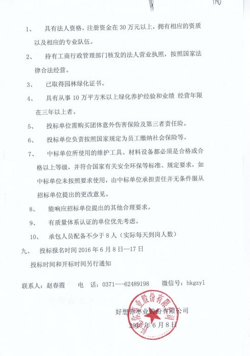 關于好想你棗業股份有限公司新廠區園區綠化養護招標