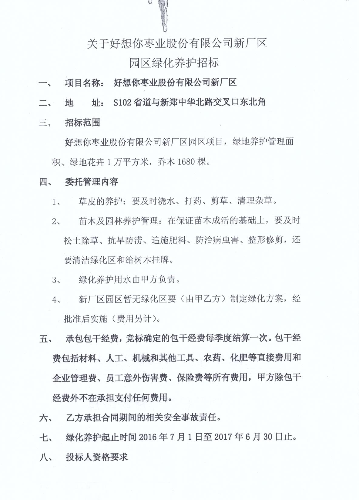 關于好想你棗業股份有限公司新廠區園區綠化養護招標
