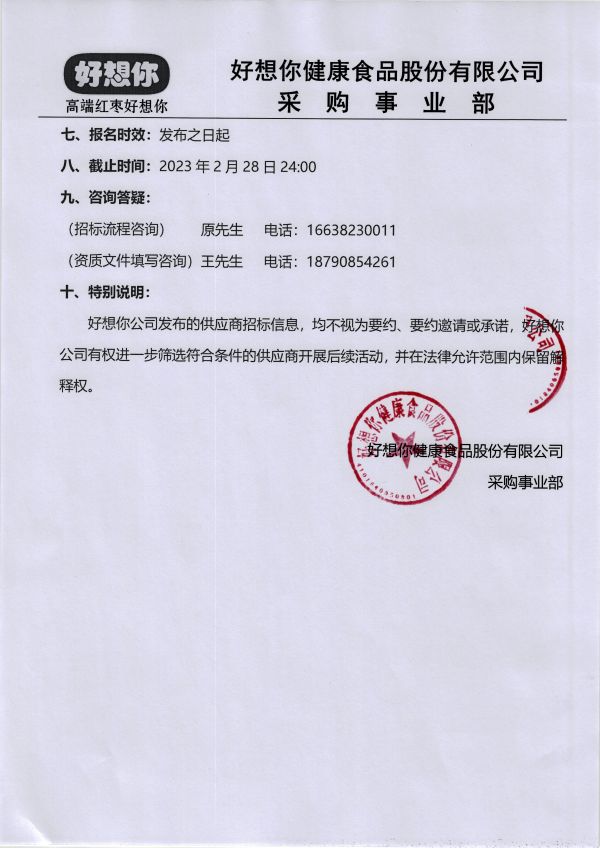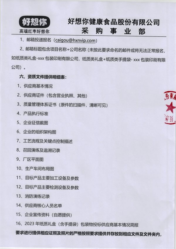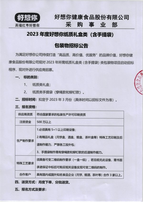 2023年度好想你紙質禮盒類(含手提袋) 包裝物招標公告